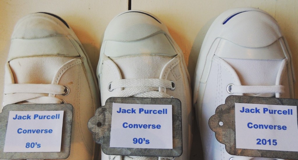 上の写真は、Jack Purcell ⑧で紹介した年代別に並べています。古さの定義づけとしてインソールのデザインで比べています。(左から右へ古い順へ並べています。)